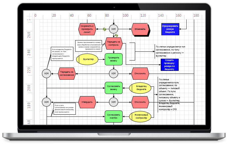 Типовая конфигурация имеет набор преднастроенных процессов, использовать которые можно сразу после подключения к Системе. Одним из часто используемых процессов является процесс согласования платежей: инициатор заполняет заявку на оплату, финансовый контролёр проверяет платеж, руководитель утверждает платёж, бухгалтер проводит оплату
